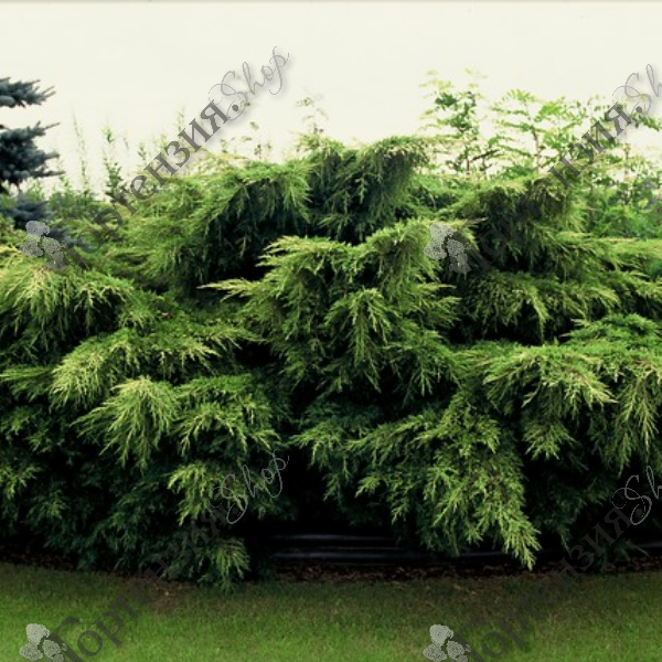 Можжевельник средний Пфитцериана Ауреа. Juniperus x-media 'Pfitzeriana Aurea' — крупное хвойное дерево с широкораскидистой кроной. Высота более 1,5 м, ширина более 2,5 м. Ветви раскидистые и слегка наклонные. Листва желто-зеленая. Предпочитает солнечные места, устойчив к легкому затенению. Хорошо переносит обрезку. Очень зимостойкий.
