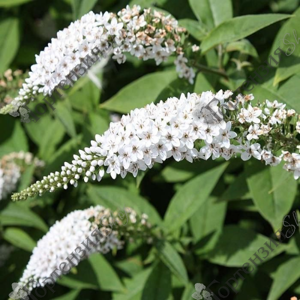 Буддлея Давида Уайт Профьюжн декоративный раскидистый с поникающими на концах ветвями. кустарник. Листья темно-зеленые овально-ланцетные опушенные. Цветет с июля по октябрь, цветки белые, собранные в колосовидные метелки длиной по 30 см, очень ароматный кустарник, медонос. Почвы предпочитает плодородные дренированные. Применяется в живой изгороди, рокариях, альпийских горках, групповых посадках. Надземная часть побегов обмерзает, но в следующий вегетационный период восстанавливается. Нуждается в укрытии. Морозостойкость -23С.