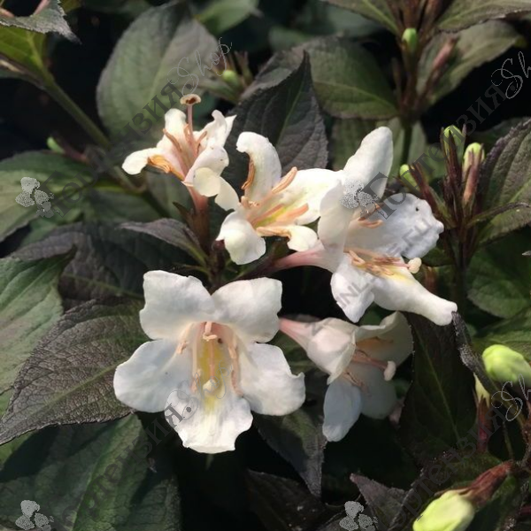 Вейгела цветущая (Weigelaflorida) Эбони энд Айвори- в мае, когда начинается цветение, от него невозможно оторвать взгляд. Многочисленные белые граммофончики обильно распускаются в течение месяца, привлекая в сад пчел и бабочек. Кустарник отличается медленным ростом и компактными размерами. Максимальная высота взрослого растения 1,2 м.