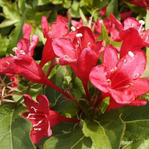Вейгела цветущая (Weigela florida) Эвита - Небольшой кустарник до одного метра в высоту. Относится к быстрорастущим, скорость роста – 20 см в год. Цветет с июня по август, цветы алого цвета, собранные в соцветия по 3-4 цветка. Любит открытую местность и прямые солнечные лучи, но и в тени будет чувствовать себя неплохо, лишь цветение будет не такое обильное. На зимний период обязательно растение нужно укрывать. Weigela florida «Evita» используется в декоративных посадках как элемент ландшафтного дизайна. Хорошо показывает себя в городских парках и садах, может использоваться как элемент живой изгороди.