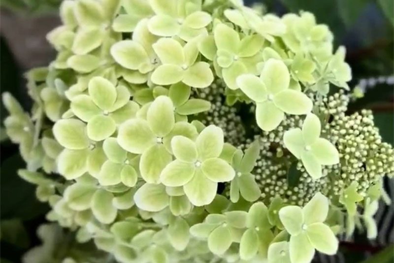 В начале цветения лепестки чистого лаймового цвета, далее постепенно образуется на стерильных цветках розовая кайма. В августе лаймовый цвет начинает преображаться в розовые оттенки, переходя в насыщенные яркие тона. С появлением контрастных ночных и дневных температур, лепестки приобретают малиново-бордовый оттенок с характерным металлическим оттенком.